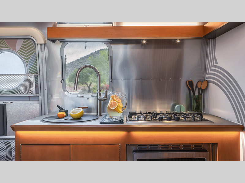 The sleek and resilient fluorocarbon-treated, UV-protected aluminum exterior provides a durable and weather-resistant shell in any environment, while the 4 High-Torque powered stabilizer jacks provide a rock-solid stability. Inside, you'll enjoy elegant seamless vinyl flooring and sophisticated LED Interior lighting with Bluetooth control, creating a warm and inviting ambiance, and the premium JL audio stereo with Bluetooth, subwoofer, and four Klipsch speakers delivers rich, crystal clear sound.