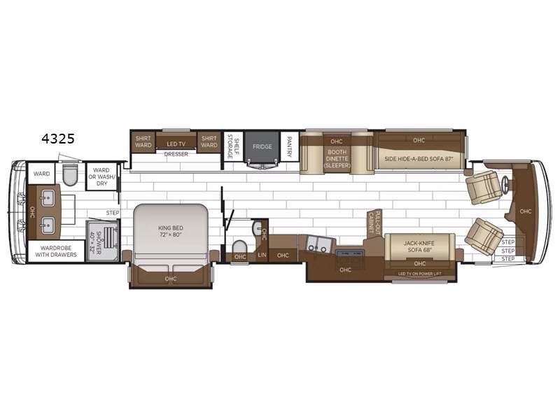 Sleeps 5 Slides 3 Length 43 ft 9 in Ext Width 8 ft 6 in Ext Height 13 ft 1 in Int Height 6 ft 11 in Interior Color Alora, Bayshore, Catalina, Stratton Exterior Color Champagne, Salsa, Seaspray, Steely Hitch Weight 15000 lbs GVWR 51000 lbs Dry Weight 40000 lbs Cargo Capacity 11000 lbs Fresh Water Capacity 105 gals Grey Water Capacity 75 gals Black Water Capacity 55 gals Furnace BTU 50000 btu Generator 10.0 Kw Onan Fuel Type Diesel Engine Cummins 8.9L Chassis Freightliner Tag Axle Horsepower 450 hp Fuel Capacity 150 gals Wheelbase 288 in Available Beds King Torque 1250 ft-lb Refrigerator Type Whirlpool Refrigerator Size 19.7 cu ft Convection Cooking Yes Cooktop Burners 3 Shower Size 50" x 34" Number of Awnings 1 Axle Weight Front 19000 lbs Axle Weight Rear 20000 lbs Axle Weight Tag 12000 lbs LP Tank Capacity 22 gals Water Heater Type Demand AC BTU 45000 btu TV Info LR Samsung LED TV, BR Samsung LED TV Awning Info Girard® G2000 power with wind sensor, remote control & LED lights Washer/Dryer Available Yes Gross Combined Weight 66000 lbs Shower Type Shower w/Seat Electrical Service 50 amp Similar Floorplans