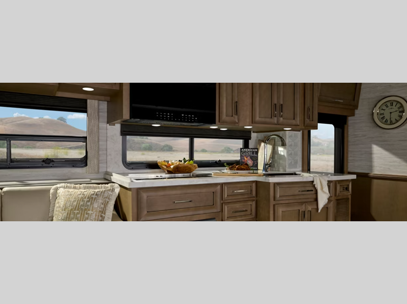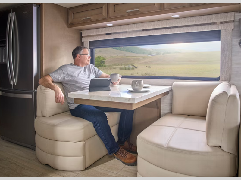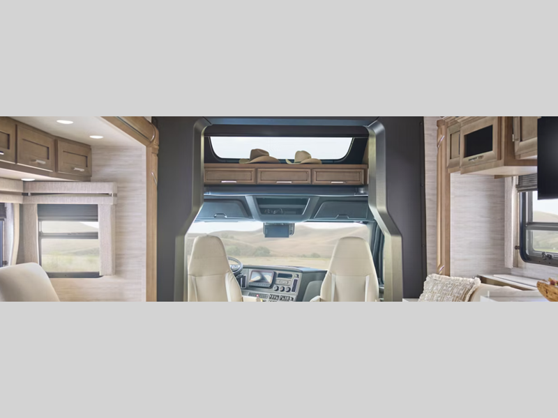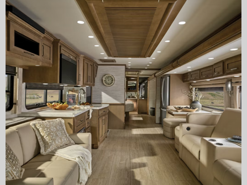 Inside, the Supreme Aire feels more like a high-end residence than a motorhome, with refined cabinetry, premium seating options, and a thoughtfully designed living area that can be tailored to how you relax. A sky window above the cockpit brings in natural light when you want it, and the power shade lets you dial it back for movie nights or mid-day naps. Up front, air-ride captain’s chairs, a modern digital dash, and the Xite infotainment system work together to make every mile feel smooth, quiet, and under control.