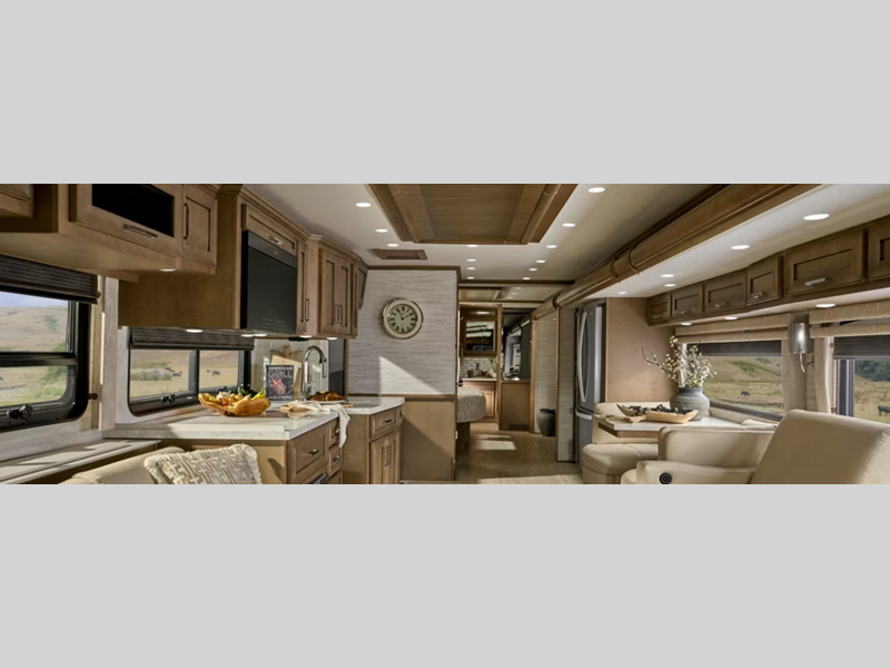 Sleeps 5 Slides 3 Length 38 ft 11 in Ext Width 8 ft 6 in Ext Height 13 ft 2 in Int Height 6 ft 11 in Interior Color Brighton, Saguaro, Palisades Exterior Color Blanco, Harding, Laughton, Portage, Seldovia GVWR 41000 lbs Dry Weight 35500 lbs Fresh Water Capacity 150 gals Grey Water Capacity 85 gals Black Water Capacity 52 gals Furnace BTU 50000 btu Generator 8.0 kW Cummins Onan Fuel Type Diesel Engine Cummins DD13 Chassis Freightliner Cascadia 116 Horsepower 525 hp Fuel Capacity 120 gals Wheelbase 328 in Available Beds King Torque 1850 ft-lb Refrigerator Type Whirlpool Refrigerator Size 19.7 cu ft Convection Cooking Yes Cooktop Burners 2 Shower Size 40" x 32" Number of Awnings 2 Axle Weight Front 18000 lbs Axle Weight Rear 23000 lbs Water Heater Type Demand AC BTU 30000 btu TV Info LR 50" 4K LED TV on Lift, BR Samsung LED TV, EXT 43" Samsung® 4K LED TV Awning Info Girard® G2000 Power Side Awning with Wind Sensor Washer/Dryer Available Yes Gross Combined Weight 61000 lbs Shower Type Shower w/Seat Electrical Service 50 amp Solar Wattage 10 watts Similar Floorplans